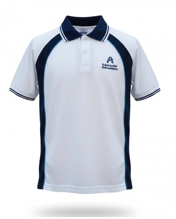 POLERA PIQUE MC UNISEX BLANCO/AZUL ADVENTISTA